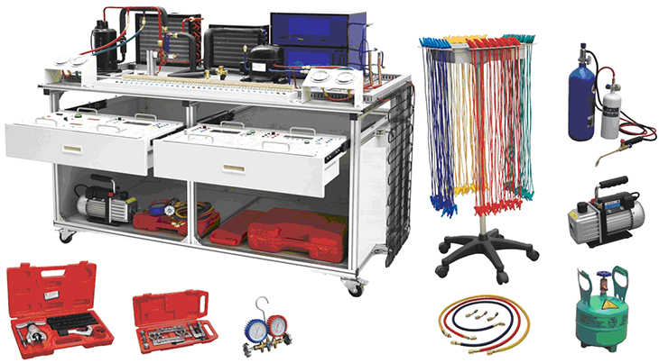1、實訓(xùn)臺采用鋁型材臺架加實訓(xùn)模塊結(jié)構(gòu),裝置采用一體化設(shè)計,由導(dǎo)軌式鋁合金安裝平臺、空調(diào)系統(tǒng)、電冰箱系統(tǒng)、電氣控制系統(tǒng)等組成。底部安裝有四個帶剎車的腳輪,可以方便的移動和固定。設(shè)備配置空調(diào)制冷系統(tǒng)管路1套、直冷電冰箱制冷系統(tǒng)管路1套、安全插端子排,壓力表(1.5MPa)2只(3.5 MPa)2只等。