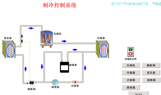 5、工作流程圖板3套:工作流程圖板詳細(xì)說(shuō)明制冷系統(tǒng)流程、監(jiān)測(cè)點(diǎn)溫度、系統(tǒng)壓力、工作狀態(tài)指示、系統(tǒng)部件說(shuō)明。