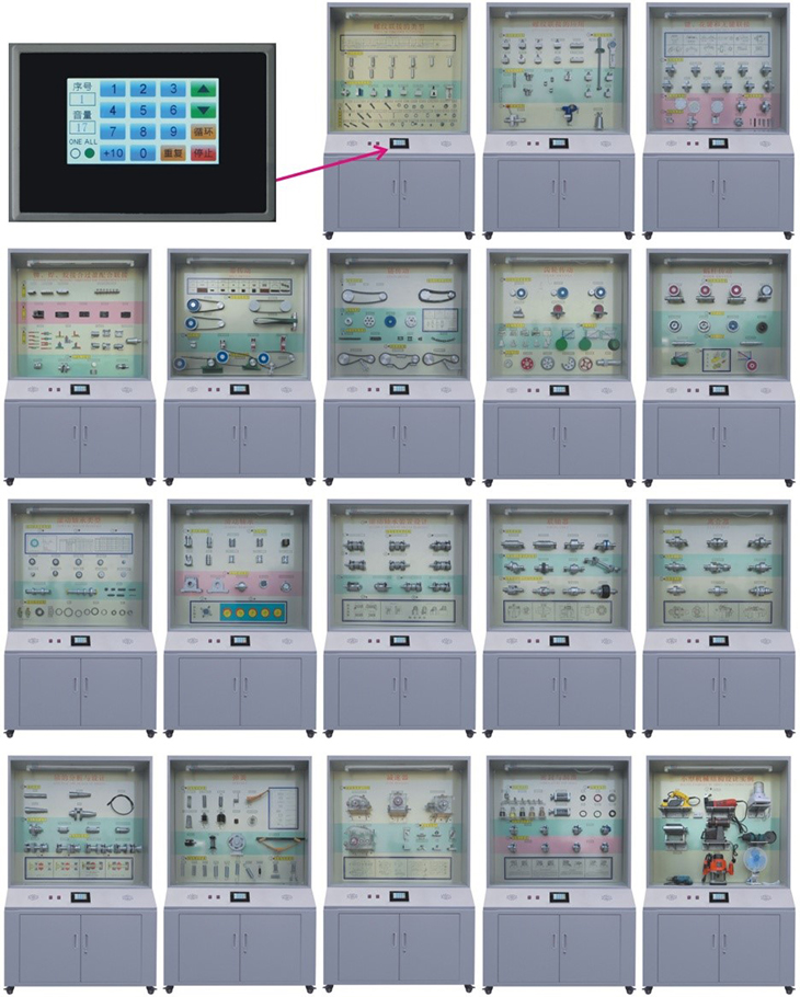 機械設(shè)計零件陳列柜,是根據(jù)機械設(shè)計(零件)課程基本要求設(shè)計制造的實驗設(shè)備。陳列柜通過機械零件模型或?qū)嵨,配合相?yīng)的圖文資料,形象地展示與解說機械設(shè)計的基本知識,加強學(xué)生對通用機械零件的類型、結(jié)構(gòu)特點及其設(shè)計的感性認知,為進一步學(xué)習(xí)機械設(shè)計奠定基礎(chǔ)。