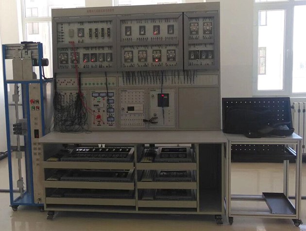 1、模型電梯設(shè)4層4站,由模擬井道架、轎廂、對重、曳引機、電梯門、門電機、各層站外呼盒及主要安全裝置組成,固定設(shè)置在實驗臺側(cè)面。模擬井道架內(nèi)需配置用于檢測轎廂位置的樓層感應(yīng)器、平層感應(yīng)器(與實際電梯相似)等,其接線端子引至模擬井道架的插接孔上。井道架采用金屬材料為主體支架,有機玻璃封閉!镌O(shè)備必須采用臺式結(jié)構(gòu),設(shè)置活動式抽屜電氣板,每層抽屜板均設(shè)置有公共接線板(總線型接線方式,總線連接點數(shù)必須達到120點以上),抽屜電氣板之間采用工業(yè)坦克鏈連接,公共抽屜板連線采用真實電梯多芯隨行電纜。